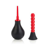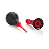 It may be used with or without ribbed attachment. It has a tapered nozzle for quick assembly, a pliable latex bulb, and a ribbed attachment for additional pleasure. 7 1/2 length bulb, 6 length attachment. Better use water soluble lubricant on mount for ease of penetration and comfort.
