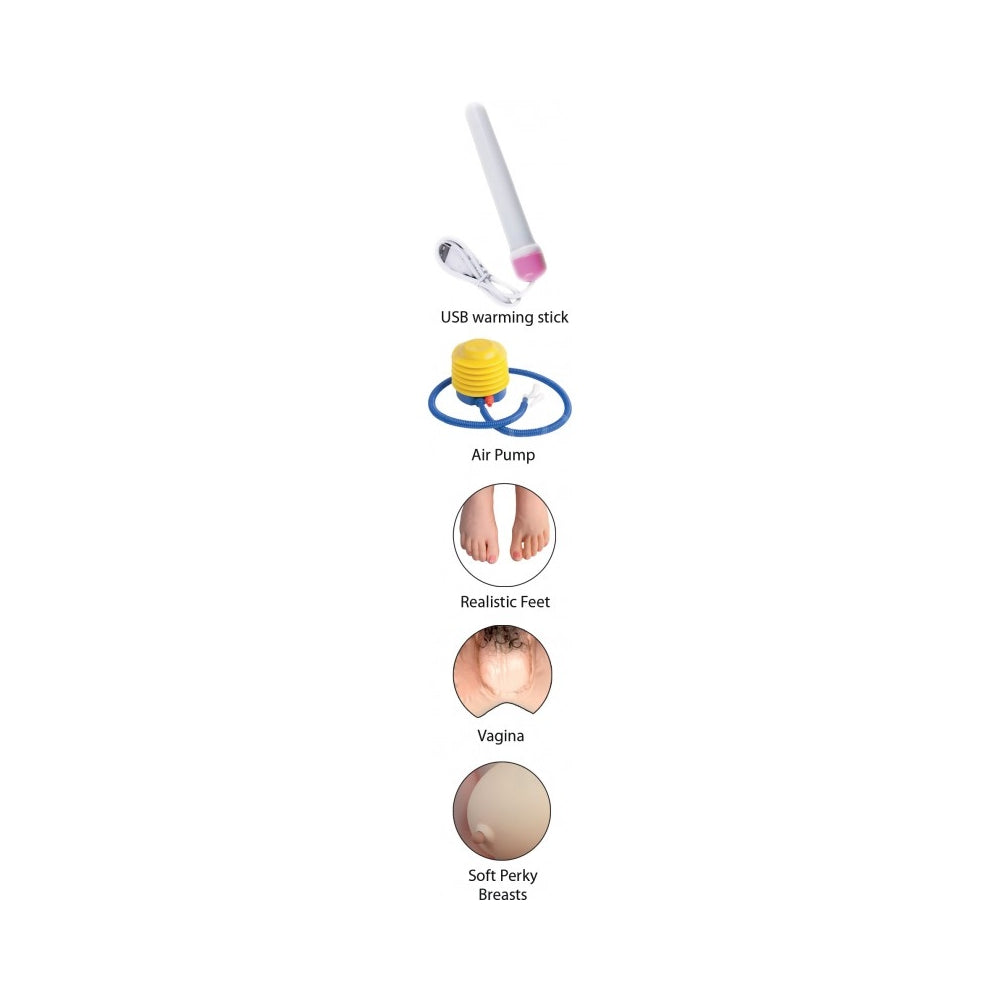 Features enhanced lips, realistic pussy lips, tight pear shaped ass with a super soft realistic anus, soft perky breasts and erect pink nipples. Waterproof. Includes USB warming stick, air pump and repair kit, vibrating egg and sensual sound effects.